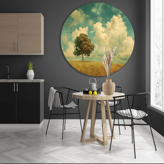Boom in een uitgestrekt veld onder wolken aluminium muurcirkel