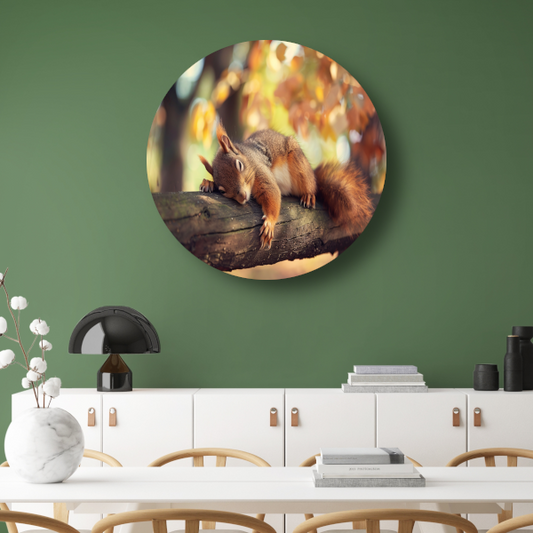 Eekhoorn geniet van herfstige rust aluminium muurcirkel