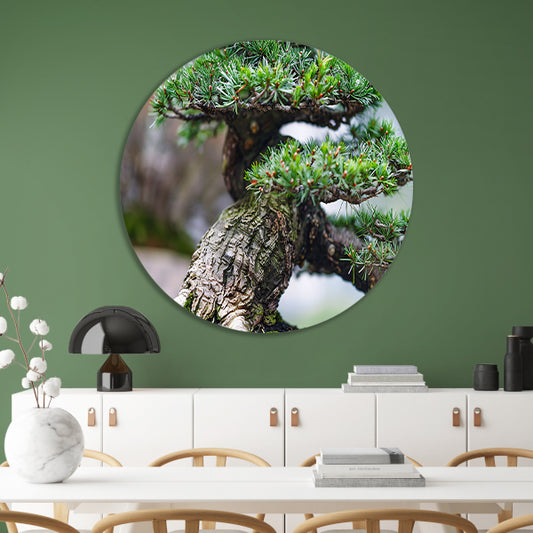 Gedetailleerde close-up van een bonsai boom aluminium muurcirkel