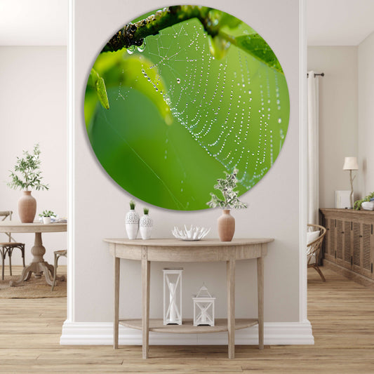 Dauw bedekt spinnenweb in close-up aluminium muurcirkel