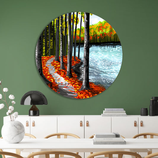 Kleurrijke abstracte bos schilderij in herfst aluminium muurcirkel