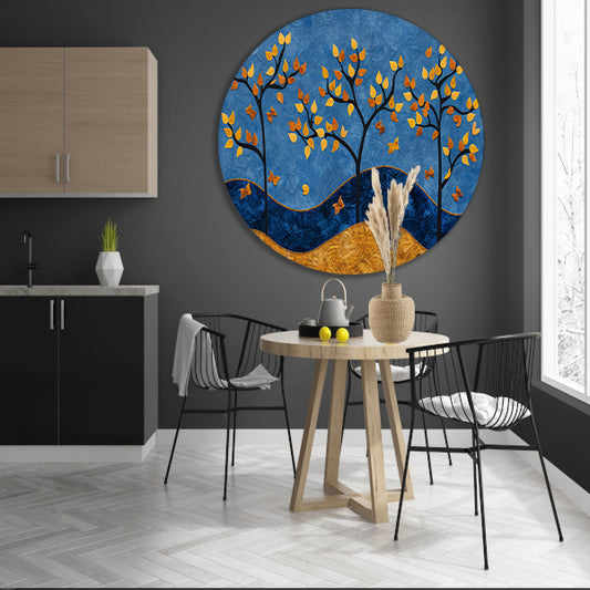 Herfstbomen op kleurrijke blauwe achtergrond aluminium muurcirkel