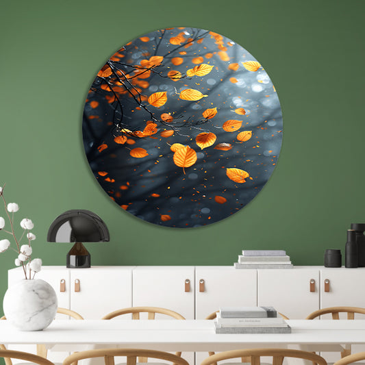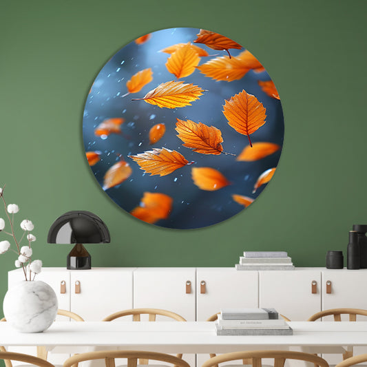Oranje Bladeren Dansen in de Regen aluminium muurcirkel