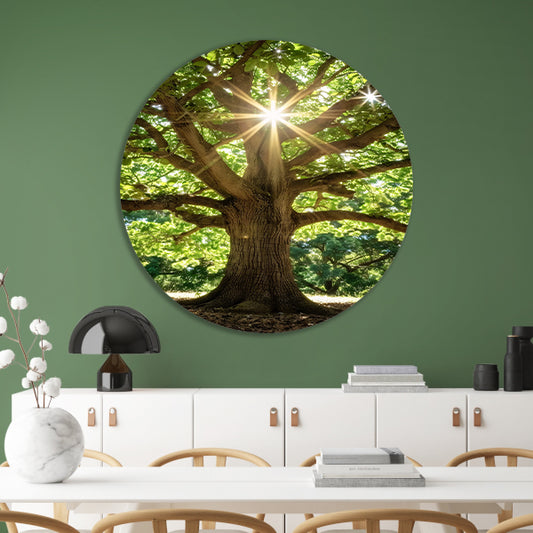 Zonnestralen door een majestueuze boom aluminium muurcirkel