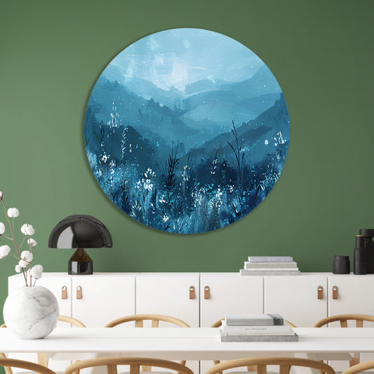 Serene bloemen en bergen in blauw aluminium muurcirkel