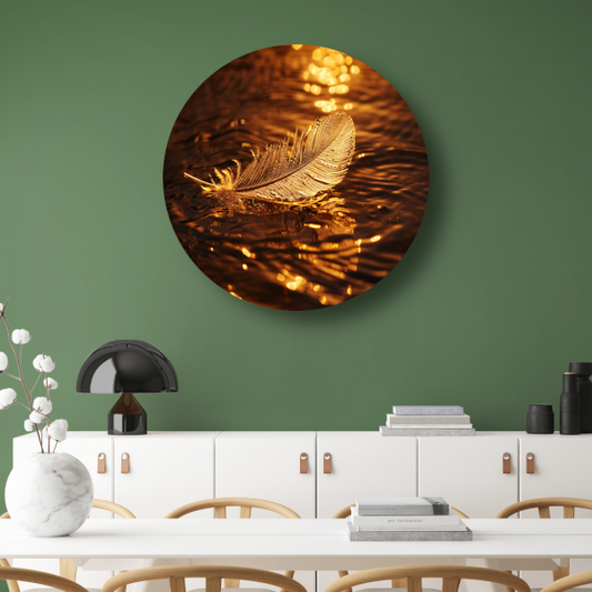Gouden veer drijvend op water bij zonsondergang aluminium muurcirkel