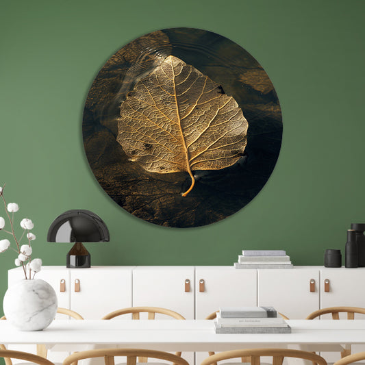 Blad met gouden nerven drijft op donker water aluminium muurcirkel