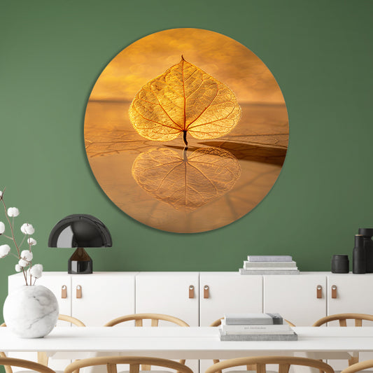Blad perfect weerspiegeld in gouden licht aluminium muurcirkel