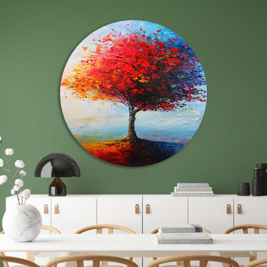 Expressieve kleurrijke boom met rode en oranje tinten aluminium muurcirkel