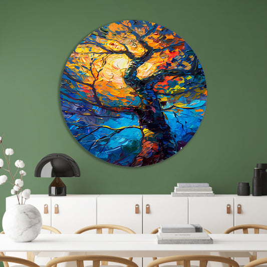 Dynamisch kleurrijk olieverfschilderij van een boom aluminium muurcirkel
