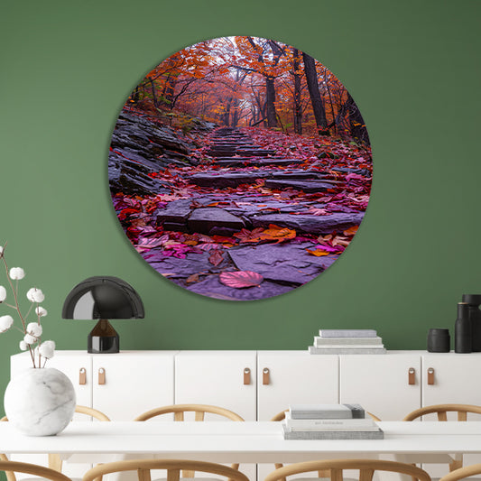 Stenen pad met herfstbladeren in het bos aluminium muurcirkel