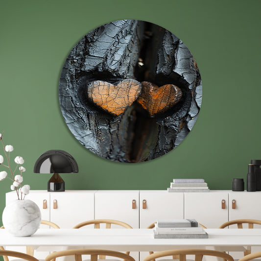 Twee Harten in Verbrande Boomschors aluminium muurcirkel