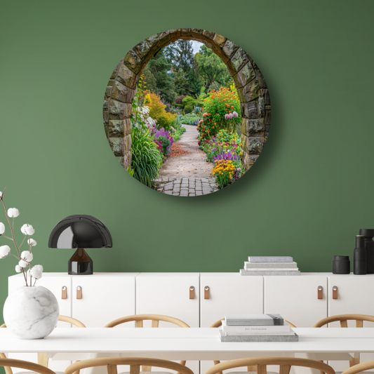 Kleurrijke Tuin door Stenen Boog aluminium muurcirkel
