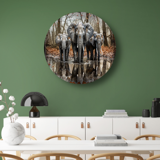 Olifanten met Waterreflectie in Boslandschap aluminium muurcirkel