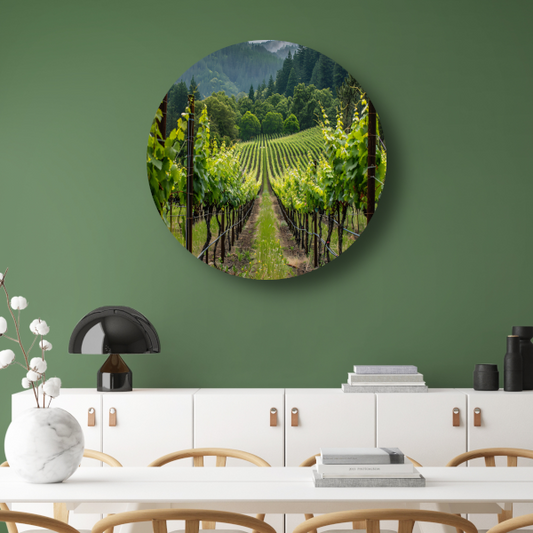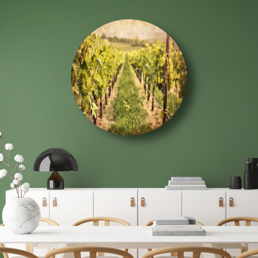 Lichtspel in de ochtendwijngaard aluminium muurcirkel