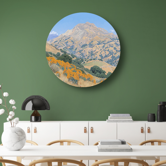 Heuvelachtig landschap met bloemen en berg aluminium muurcirkel