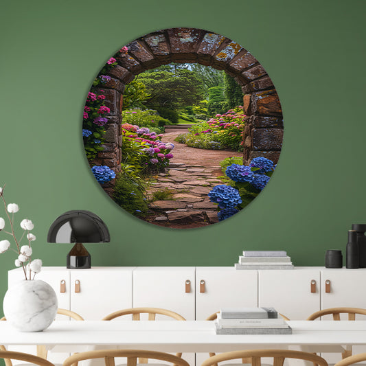 Betoverende Bloementuin met Stenen Boogpad aluminium muurcirkel