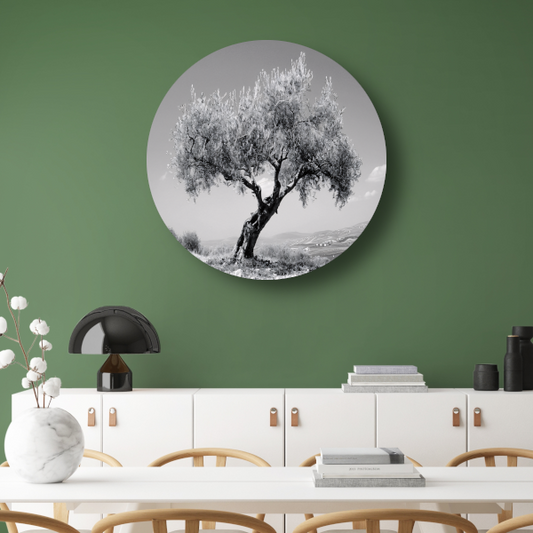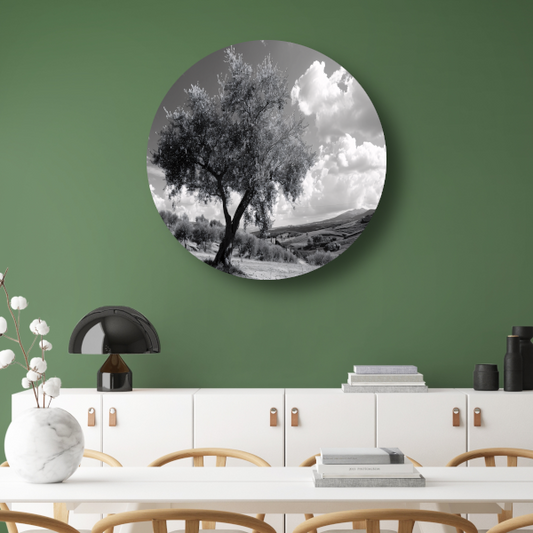 Zwart-wit olijfboom landschap aluminium muurcirkel