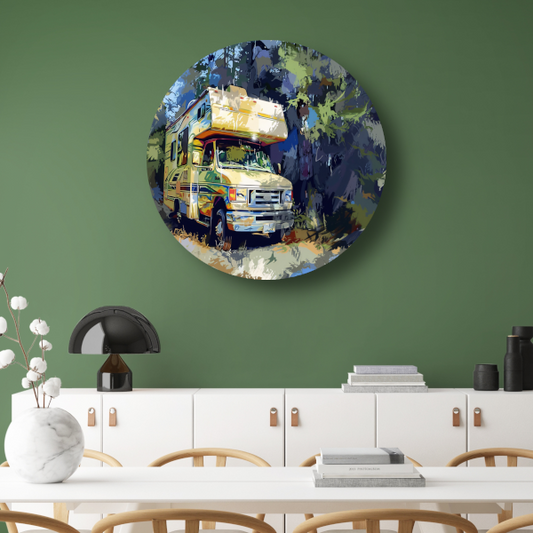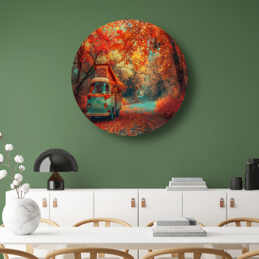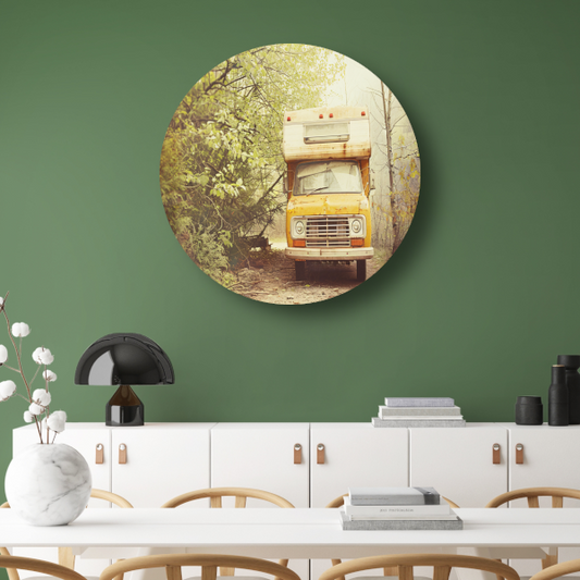 Oude camper verscholen in herfstbos aluminium muurcirkel