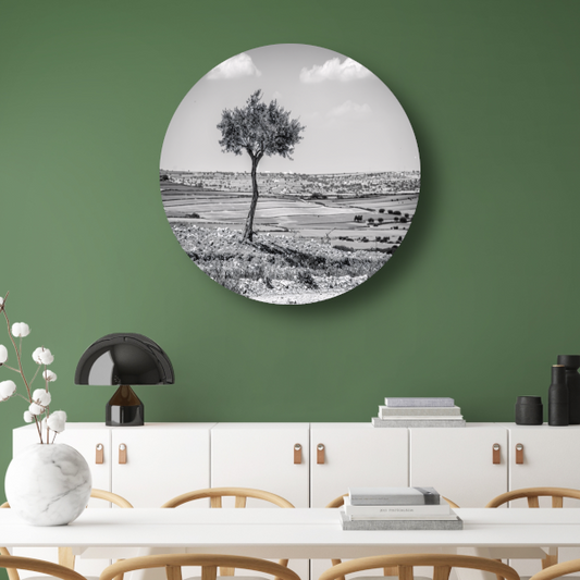 Klassieke Olijfboom in Zwart-Wit aluminium muurcirkel