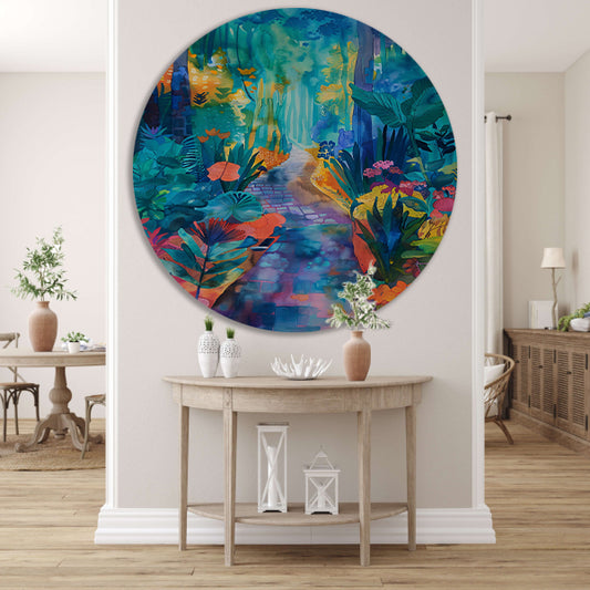 Kleurrijk schilderij van een bloemenrijk bos aluminium muurcirkel