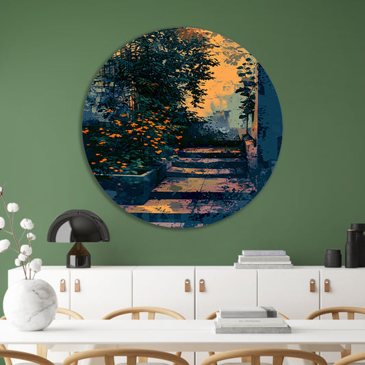 Serene tuin bij zonsondergang, digitale kunst aluminium muurcirkel