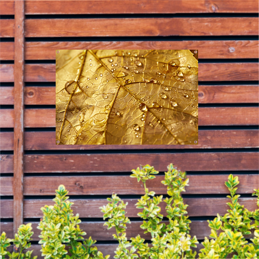 Waterdruppels op goudkleurig blad in detail tuinposter