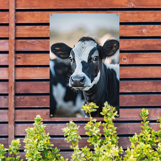 Zwart-Wit Portret van een Nieuwsgierig Kalf tuinposter
