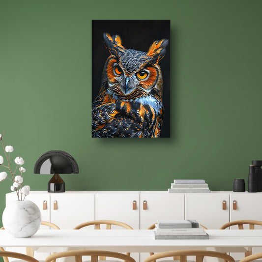 Hyperrealistische Uil met Intense Ogen en Kleurrijke Veren acrylglas