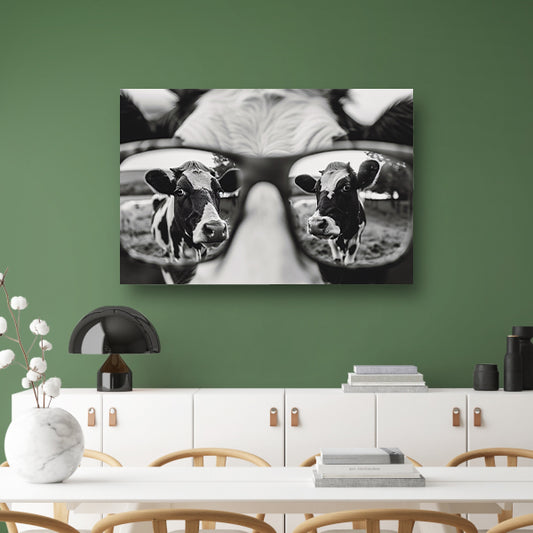 Reflectie van een nieuwsgierige koe in een bril poster