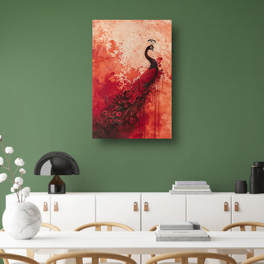 Abstract schilderij van een pauw met verfspatten canvas met baklijst