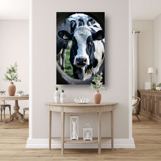 Drie zwart-wit koeien staren nieuwsgierig poster