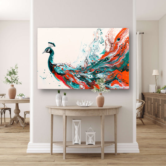 Dynamisch schilderij van een pauw in oranje canvas met baklijst