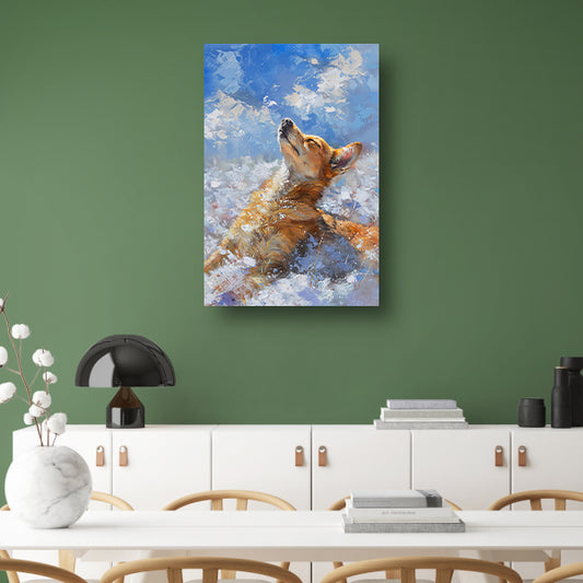 Hond genietend van de sneeuw en zon canvas met baklijst