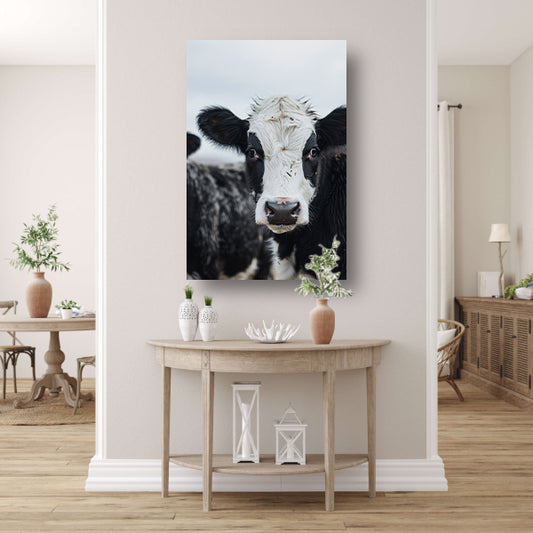 Zwart-wit portret van een nieuwsgierige koe poster