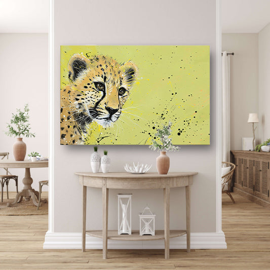 Realistisch schilderij van jonge cheeta canvas met baklijst