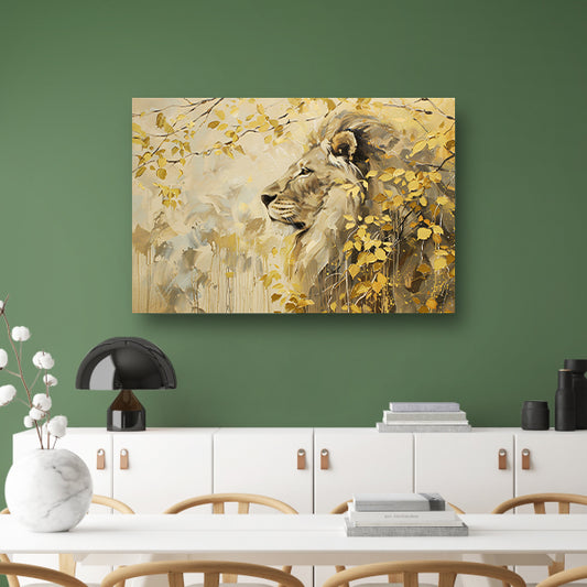 Moderne schilderij van een leeuw en bladeren canvas met baklijst