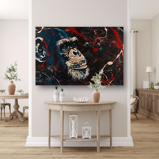 Abstract schilderij van aap met verfspetters canvas met baklijst