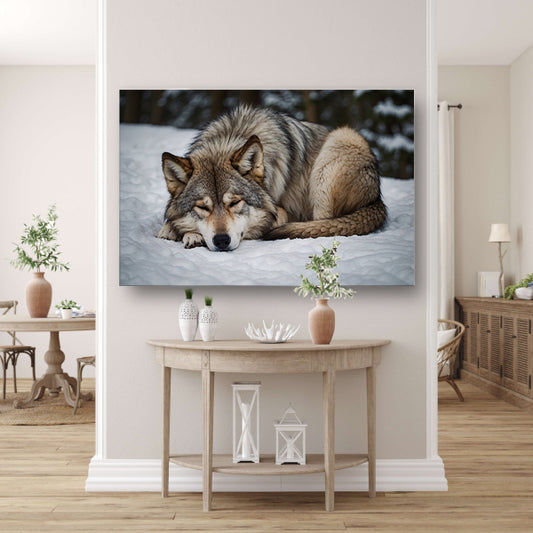 Slapende wolf in een besneeuwd landschap canvas met baklijst