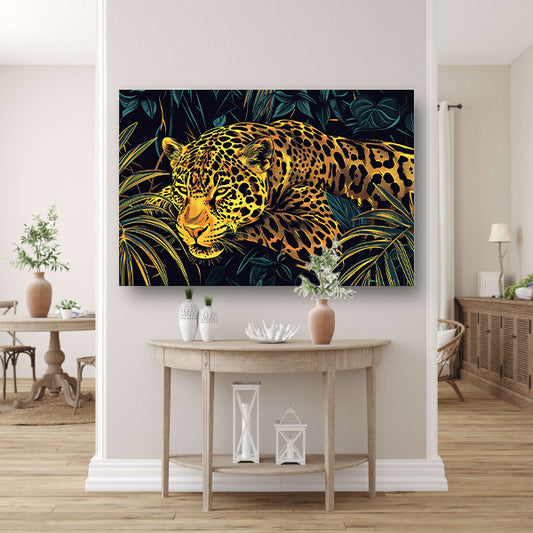 Gedetailleerde lijntekening van een jaguar in jungle canvas met baklijst