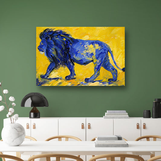 Schilderij van een abstracte blauwe leeuw canvas met baklijst