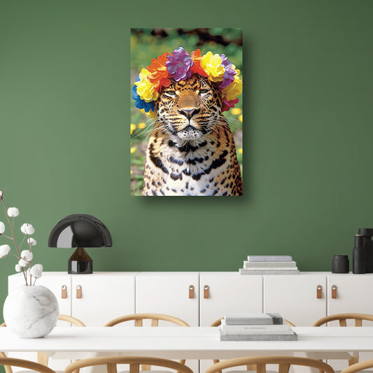 Kleurrijke Leopard met Bloemenkrans Portret canvas met baklijst