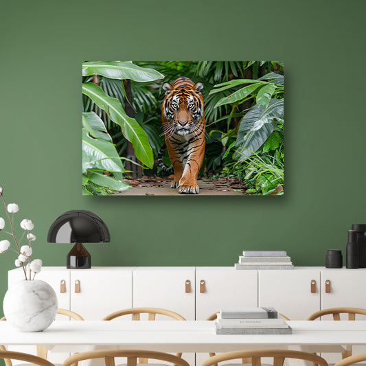 Realistische tijger in bosrijke omgeving canvas met baklijst