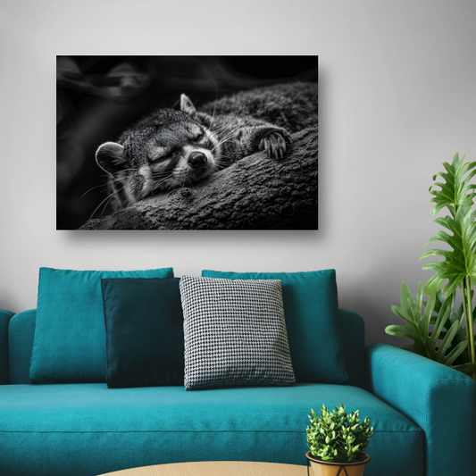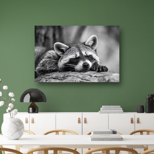 Slapende wasbeer op boomstam canvas met baklijst