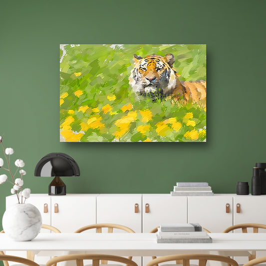 Prachtig schilderij van tijger in bloemenveld canvas met baklijst