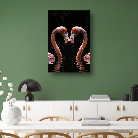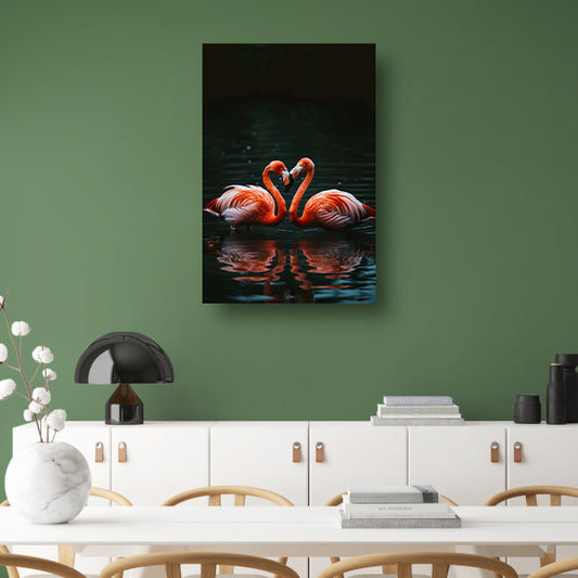 Twee felgekleurde flamingo’s in donkere water canvas met baklijst