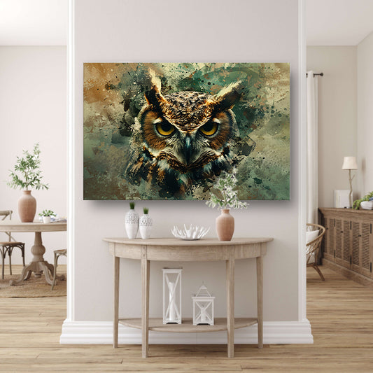 Abstracte mystieke uil met verfspatten canvas met baklijst