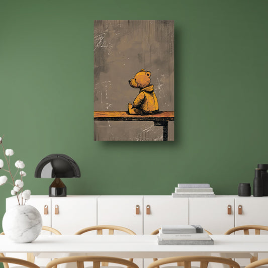 Eenzame Teddybeer op Bankje in Verlaten Landschap poster