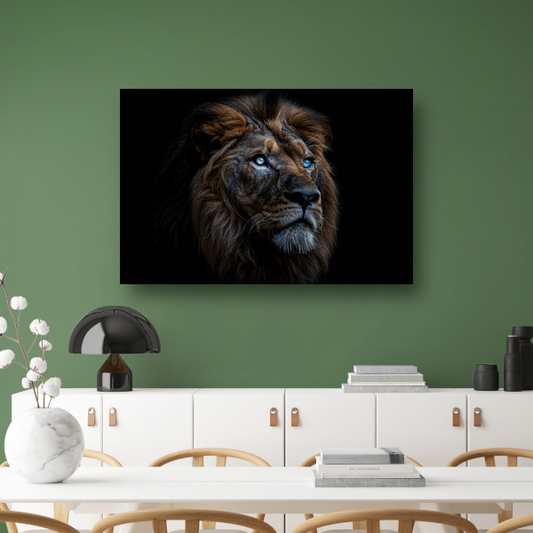 Indrukwekkend portret van majestueuze leeuw met blauwe ogen canvas met baklijst