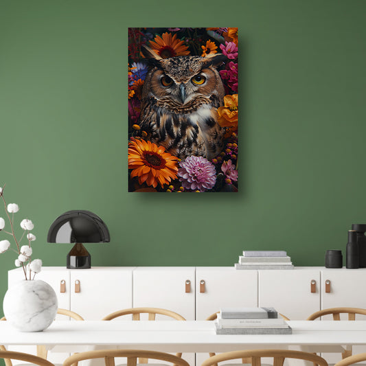 Intrigerende Uil omringd door Kleurrijke Bloei canvas met baklijst